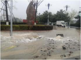 不到10分鐘,應(yīng)急搶修隊員迅速到達南湖廣場?,F(xiàn)場發(fā)現(xiàn)有大量泥沙被水沖出,這說明漏水點附近地基可能已被水流淘空。為防止發(fā)生人員安全事故,搶修人員冒著大雨站在現(xiàn)場,提醒過往車輛和行人繞行。經(jīng)現(xiàn)場仔細勘查,搶修人員迅速制定維修方案,并投入到緊張的搶修工作。