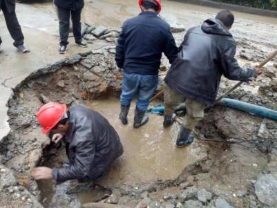 因爆管事件突發(fā),搶修人員趕到現(xiàn)場(chǎng)時(shí),水泥路面已塌陷出一個(gè)大坑,馬路上到處是積水,天空還下著雨。為了盡快修好爆裂管道,在最短時(shí)間恢復(fù)供水,搶修人員不懼艱辛,不顧泥水和雨水的困擾,齊心協(xié)力、緊張有序地進(jìn)行著漏點(diǎn)的搶修。經(jīng)過近4個(gè)小時(shí)的奮力搶修,終于完成了瑪麗醫(yī)院DN400PE管修復(fù)工作,保障了群眾正常用水。