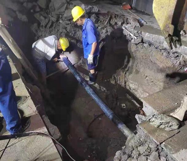 DN600管徑是襄城輸配水主管線,炎熱夏季正值用水高峰,閘門一旦關停就會造成大面積用戶停水。由于該地段有3個不同高度的地平面,而漏點又在停車場內(nèi),地形錯綜復雜不利于大型設備開挖??阂嘬姷葲]有等待,與商都負責人郭洪取得聯(lián)系一起協(xié)調車輛疏散,核實最佳地點開挖面積長15*2米,于晚22:15用水峰值下來后立即停水維修DN600開口夾板,于15日0:15分完成搶修開水,2:00完成回填維修完畢。